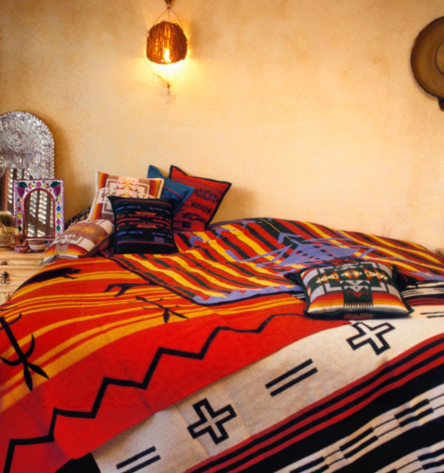 This eclectic look combines tribal influences in a modern way. Design elements include geometric patterns, Aztec and ikat prints, diamond shapes, chevrons, and woven textiles.